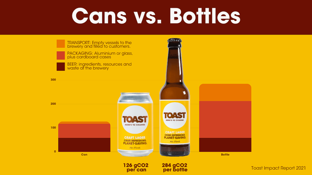 Cans have a much lower carbon footprint than bottles – less than half of the emissions (cans weighing in at 126g CO2 versus bottles at 284g CO2). Benefiting from g lightweight (heavy glass means more emissions in transport) and widely recycled (85% of aluminium cans go another round).